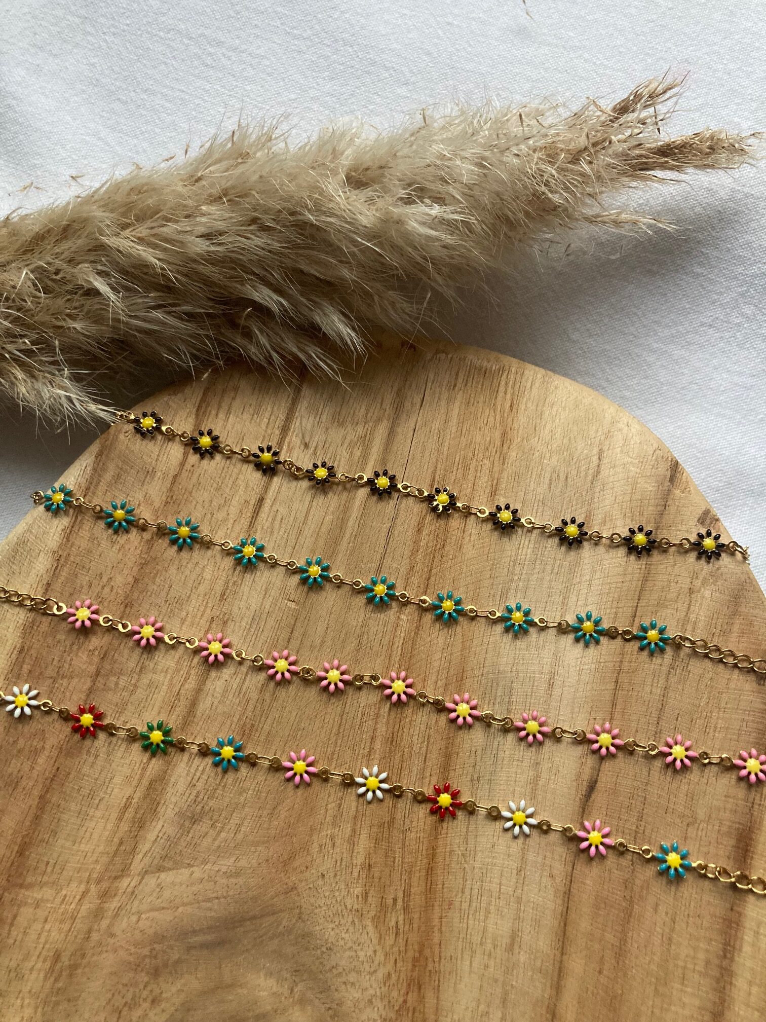 Montés sur une chaîne dorée en acier inoxydable, ces bracelets sont ponctués de mini fleurs émaillées aux couleurs éclatantes.