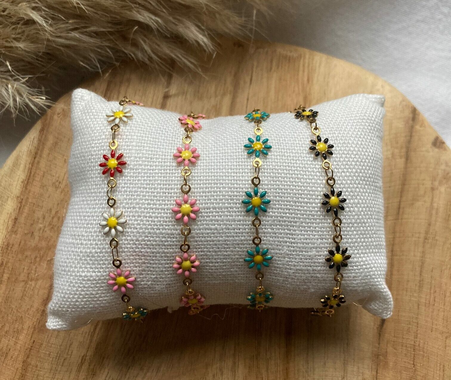 Un concentré de douceur et de bonne humeur à porter au poignet. Ces bracelets délicats, ornés de petites fleurs colorées, apportent une touche fraîche et lumineuse à toutes vos tenues.